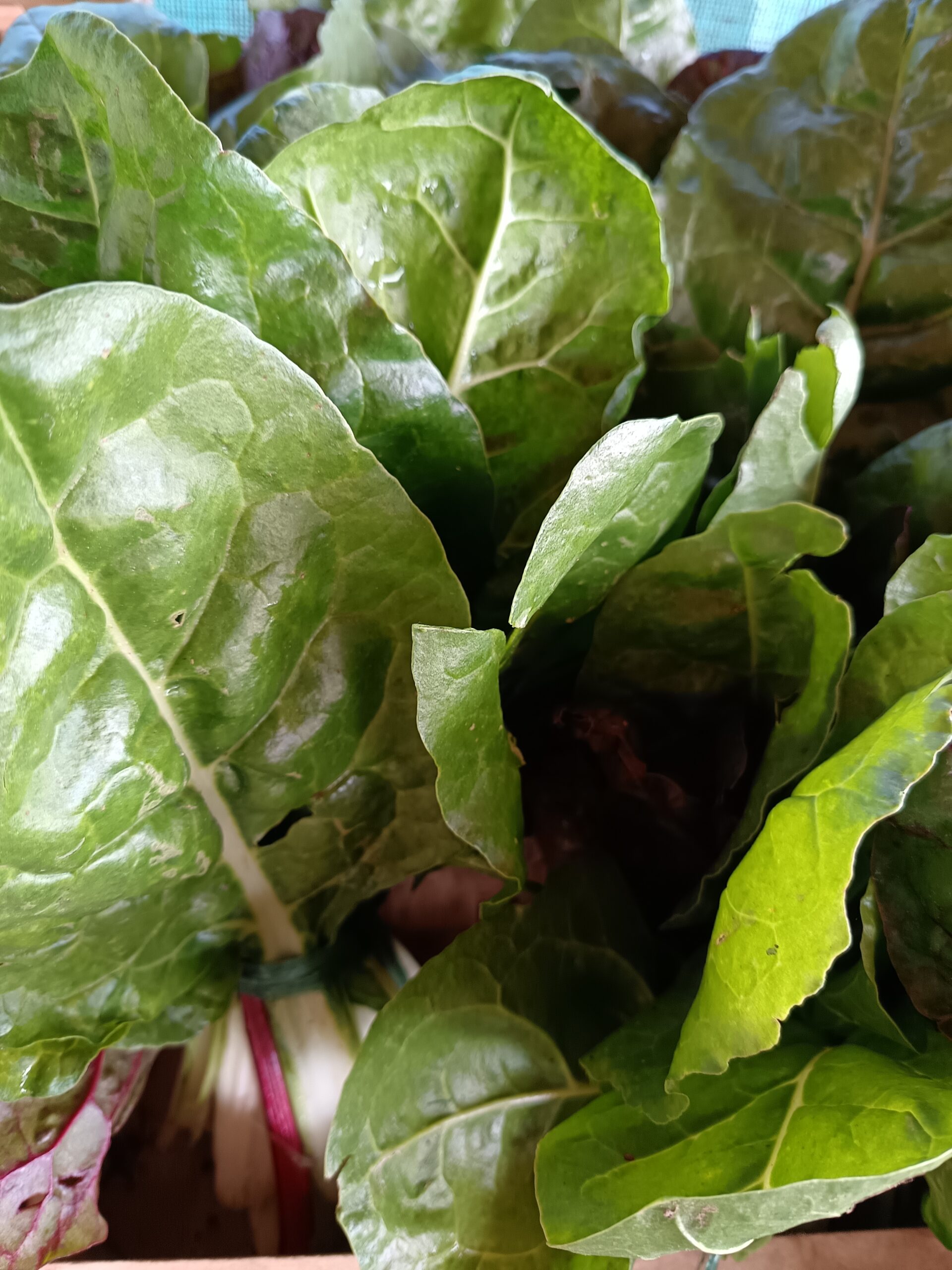 Blettes mixte récoltées le jour même. Il s’agit de blettes de différentes variétés (à cottes, fines, de couleurs)
